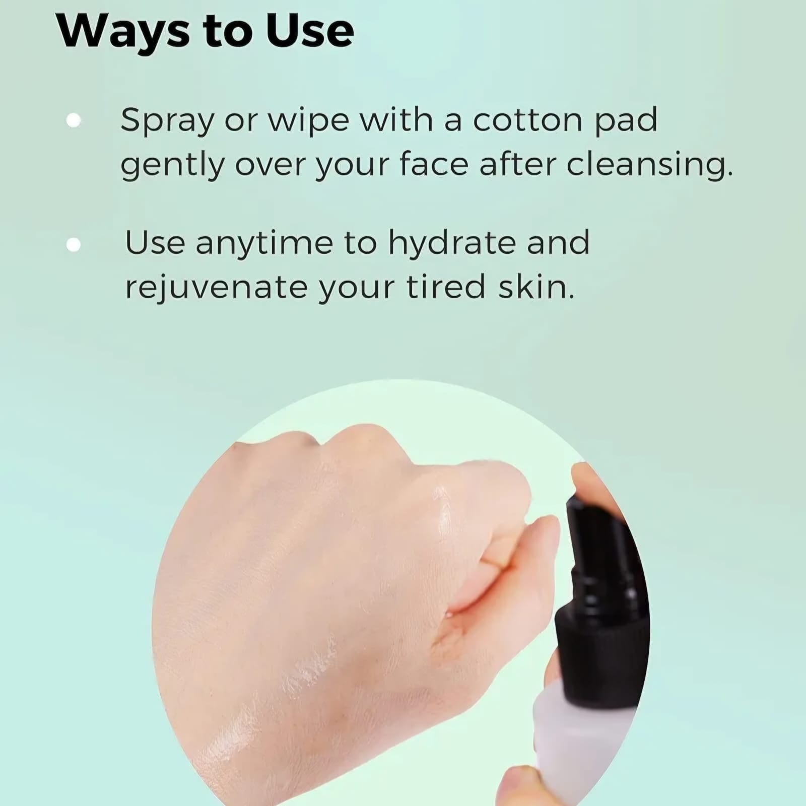 1. After cleansing, spray a moderate amount onto a cotton pad or directly onto your face.